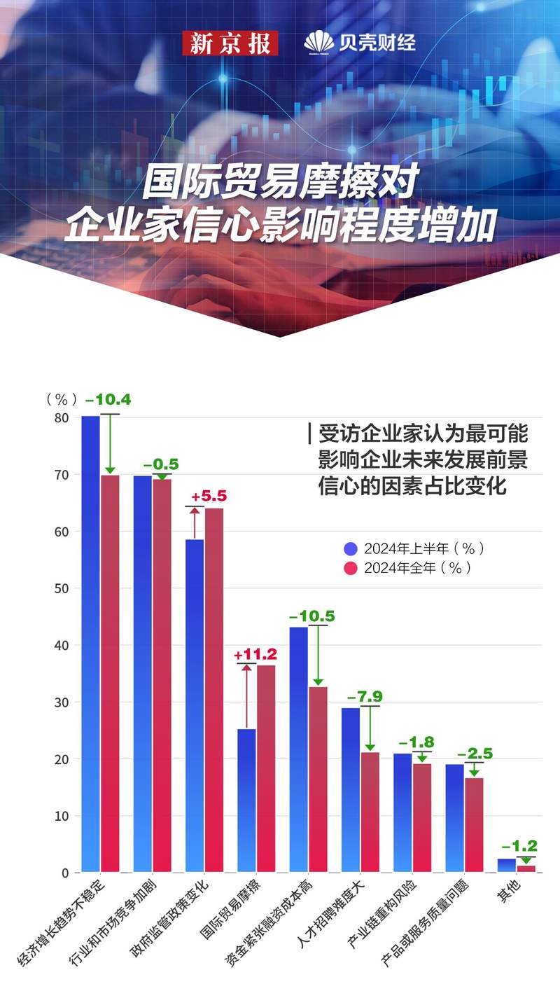 2024年11月,中国贸促会发布了9月全球经贸摩擦指数。从抽象指数来看,2024年9月,全球经贸摩擦指数为105,连续处于高位。此外,欧盟对华电动汽车加征关税以及中好意思贸易商量等对企业家的信心有所影响。比较于2024年上半年,国际贸易走势对企业家翌日信心的影响程度上升。本次调研中,36.5%的受访企业家以为国际贸易摩擦会影响其对企业翌日发展的信心,占比比较2024年上半年增长11.2个百分点。