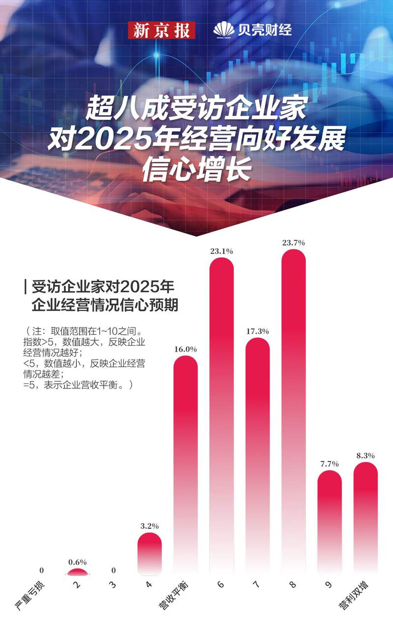 本次调研,新京报贝壳财经发现,企业家对2025年发展预期仍处于邃密景况。面对外部环境变化带来的不利影响加深,企业按捺现实改进照应和技巧升级,擢升效率与竞争力,同期通过探索国际化旅途,股东企业延续增长。