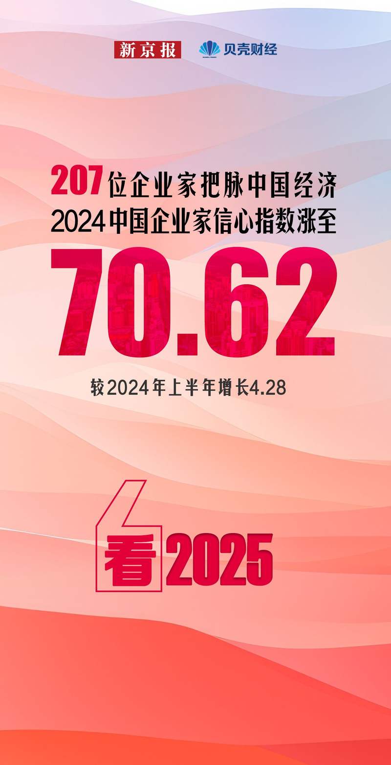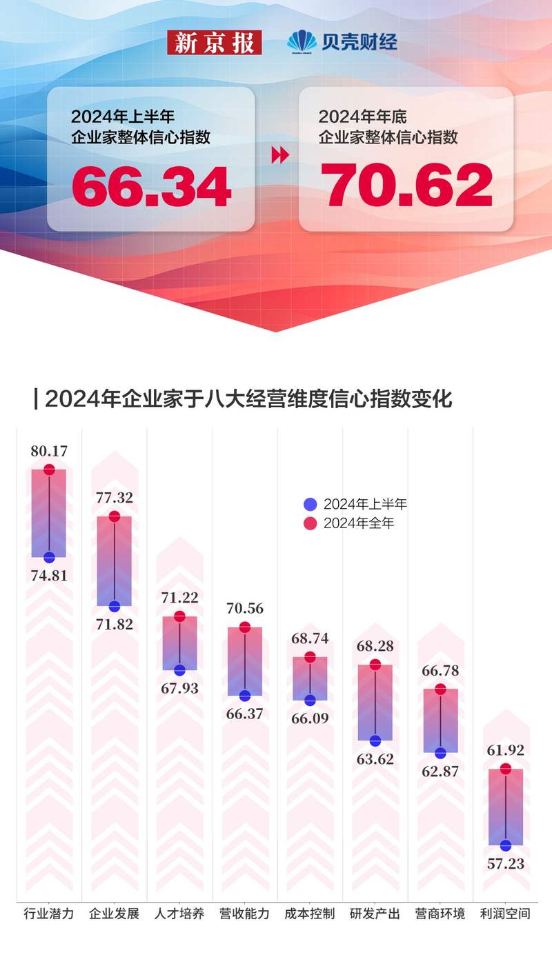 本次调研骄横,2024年下半年企业乡信心有所回升,2024年全年企业家全体信心指数为70.62,比较2024年上半年增长4.28。