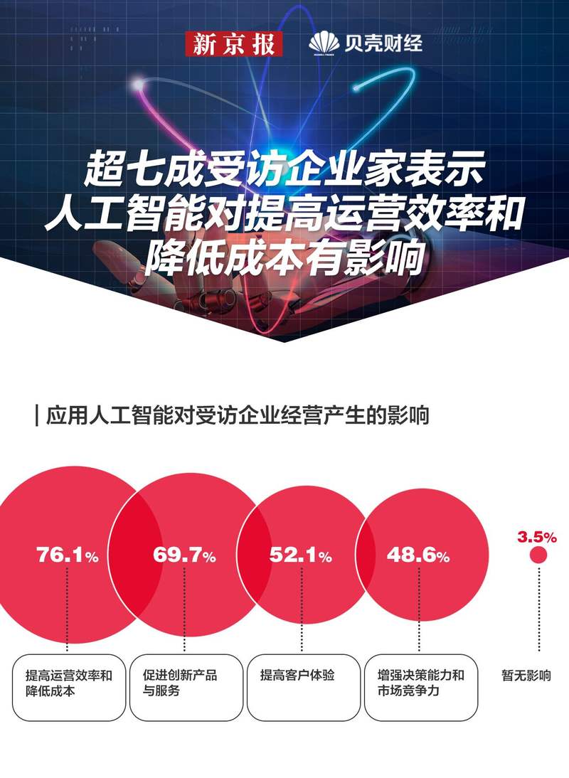东谈主工智能的变革效应渐渐长远,为百行万企带来坐褥效率和居品服务改进上的快速发展。从医疗健康到金融服务,从制造业到零卖业,AI的应用正在重塑传统模式、擢升效率并创造新的价值。76.1%的受访企业家示意,东谈主工智能在提高运营效率和镌汰资本上效率长远,尤其是在制造业和互联网及信息技巧服务业企业中。69.7%的受访企业家示意,东谈主工智能对促进改进居品与服务有积极影响。