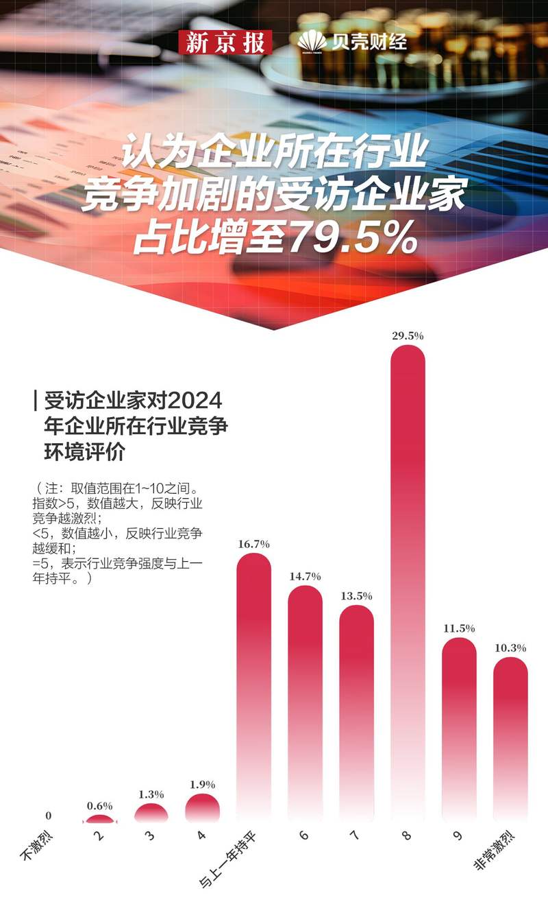 受到商场需求变化、新质坐褥力发展以及政策调治等多重身分的影响,大齐企业在各自的行业中感受到更为热烈的竞争环境。本次访问问卷数据骄横,以为企业所在行业竞争加重的受访者占比从2024年上半年的67.9%增至79.5%;以为行业竞争程度与上一年持平的受访者占比从2024年上半年的20.4%降至16.7%。