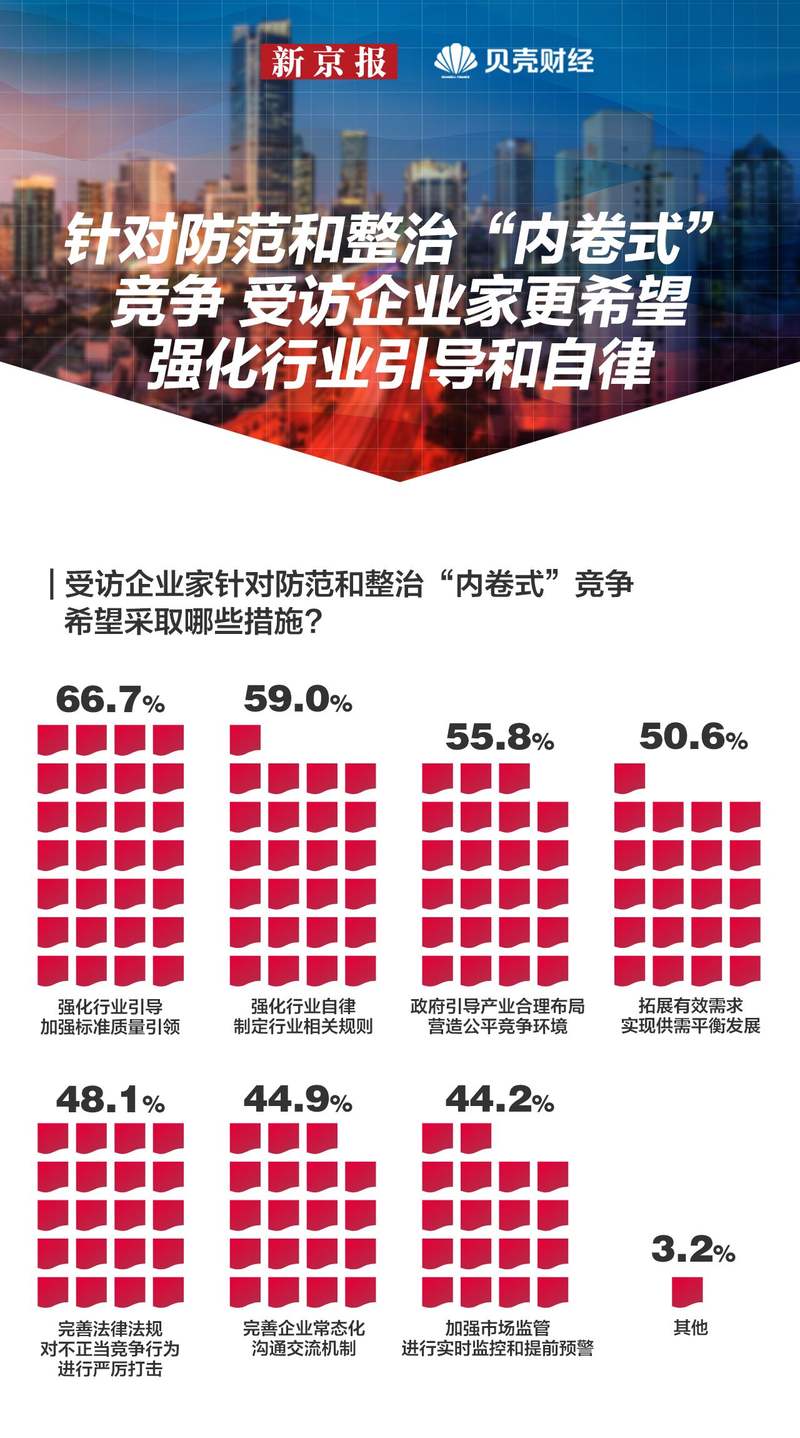 整治“内卷式”恶性竞争不仅有助于擢升企业的改进才智和社会资源的利用效率,还能为经济高质地发展提供有劲复古。但行业“内卷”若何破局,还要多方发力冲破。调研中,66.7%的受访企业家但愿强化行业诱导,加强圭臬质地引颈;59.0%以为要强化行业自律,制定行业商量顺次。