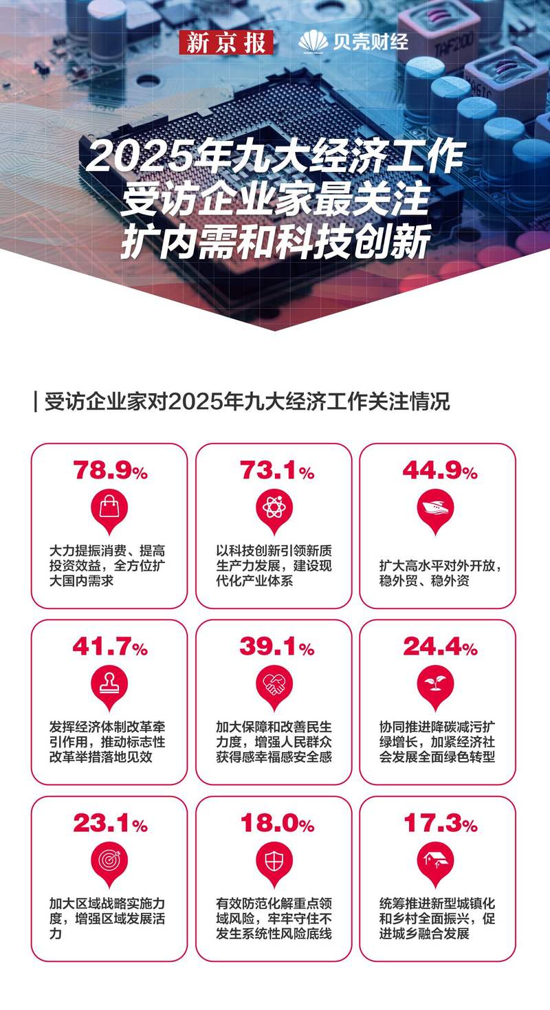此外,“两新”“两重”政策是2024年经济职责的弥留发力点,50%的受访企业家会关注2025年“以政府投资有用带动社会投资”的商量措施,40.4%的受访企业家会关注“两新”政策扩围实施情况。