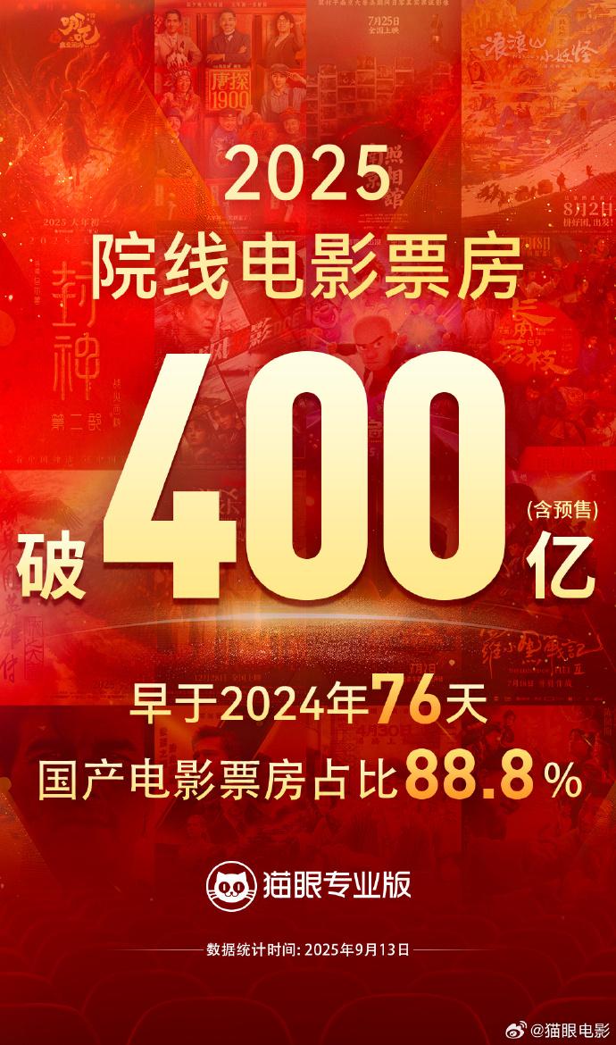 据猫眼专科版数据,2025年9月13日13时05分,2025年度票房(含预售)破400亿,早于2024年76天到达,国产电影票房占比超88.8%,年度票房榜前十均为国产电影!