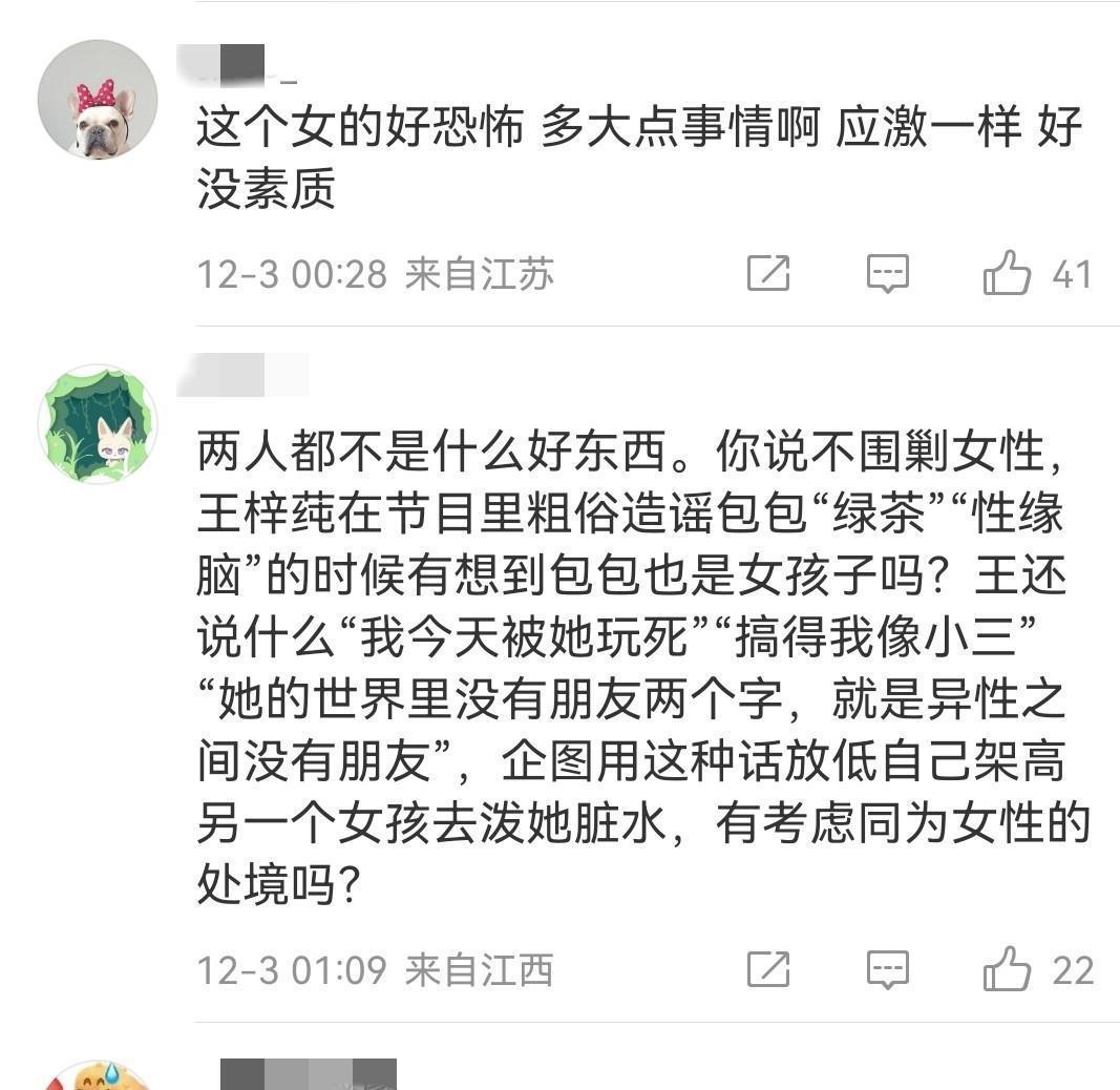 而且透彻把这个事情闹大的重要点即是王梓莼主动去找包洁仪说这个事,即是现在热搜中王梓莼“并列88花”的离谱发言