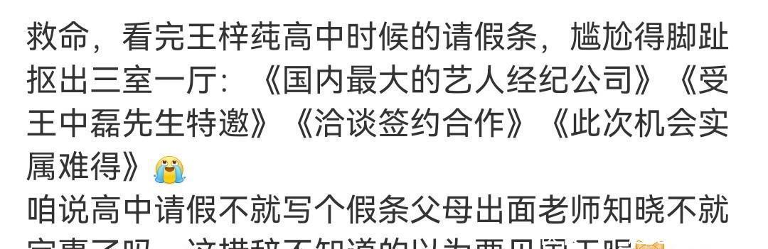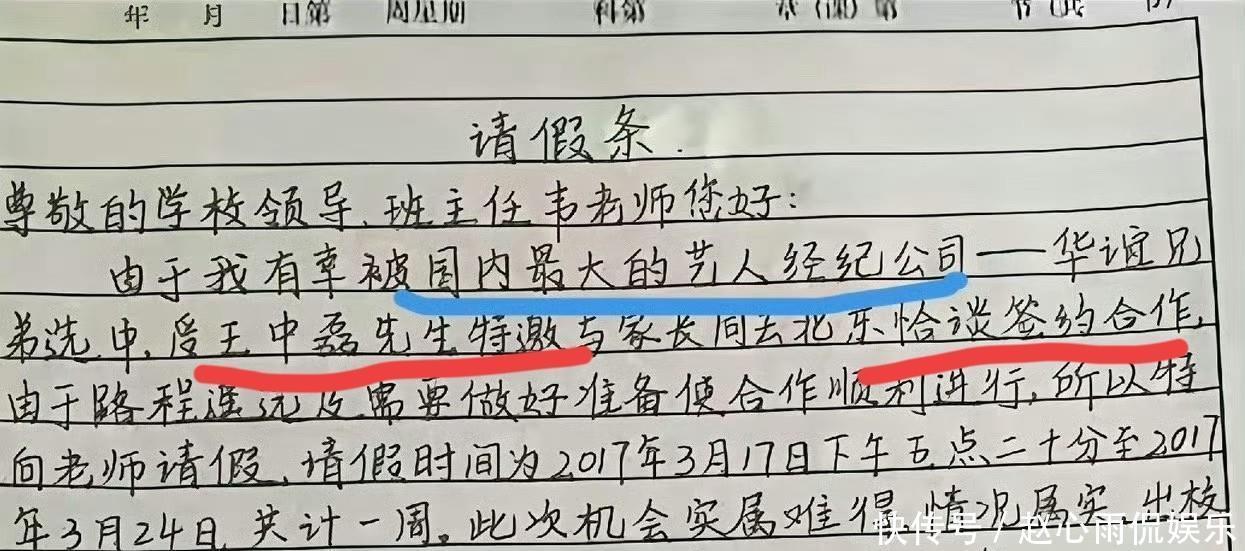 让网友都暗意难受了,毕竟其时她是个高中生,请假条写的相配之优厚,“受王中磊先生特邀”就很难念念象,简直是超等自信,如今的艺东说念主也都千千万了,一个高中生被特邀就很离谱了。