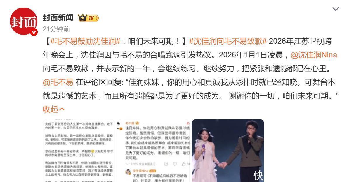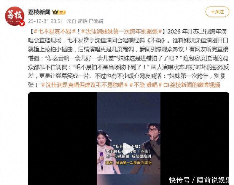 事件启事于江苏卫视跨年晚会。毛不易与沈佳润齐唱其经典代表作《不染》。联系词,初次站上如斯大型直播舞台的沈佳润,因相配焦躁,开场便出现抢拍,后续音准也出现不稳。直播镜头忠实记载下了她的紧绷,也捕捉到了毛不易的全程“护驾”:齐唱时紧捏她的手传递力量,下台阶时主动伸手搀扶,演唱时刻意压低我方的和声以幸免压制对方,情绪处置长久和睦多礼。尽管前辈如斯托举,饰演的流毒仍未能十足幸免,立时在网络上激励热议。