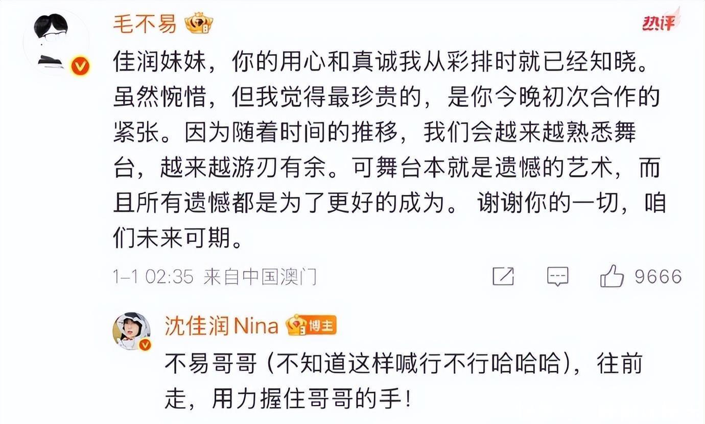约三小时后,毛不易的回话莅临沈佳润的微博挑剔区,将扫数这个词事件的走向推向蔼然的激越。他全文未提具体失实,而是写说念:“你的精心和至意我从彩排时就照旧清醒……舞台本即是缺憾的艺术,扫数缺憾皆是为了更好的成为。”他防备细目对方的勇气,强调“勇气比无缺更垂死”,并饱读舞其带着巨匠的相沿络续前行。这番回话,文笔精细,面孔开朗,既绝对化解了搭档的压力,又传递了前辈的祥和与灵巧,被网友盛赞“安慰东说念主心”、“情商天花板”。
