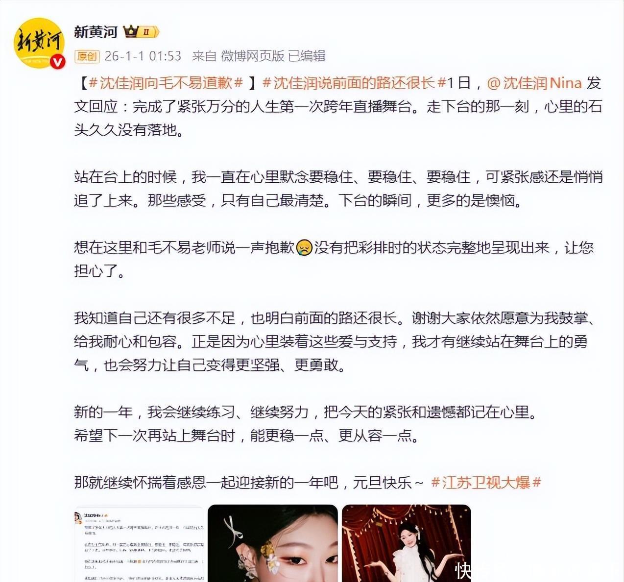 1月1日凌晨,沈佳润莫得接受千里默或辩解,而是平直发文敦厚回话。她安心承认因焦躁导致抢拍、跑调,未能达到彩排水准,并绝顶向搭档毛不易致歉:“莫得把彩排时的景况完整呈现出来,让您系念了”,同期同意将来会络续奋发。这份不推诿、直面失实的气派,率先为事件降温。