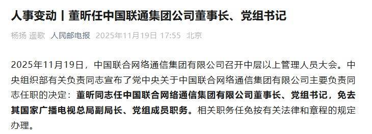 据东说念主民邮电报音信:2025年11月19日体育游戏app平台,中国连合荟萃通讯集团有限公司召开中层以上处置东说念主员大会。中央组织部探求细腻同道晓谕了党中央对于中国连合荟萃通讯集团有限公司主要细腻同道任职的决定:董昕同道任中国连合荟萃通讯集团有限公司董事长、党组秘书,免去其国度播送电视总局副局长、党构成员职务。联系职务任免按探求法律和王法的王法办理。