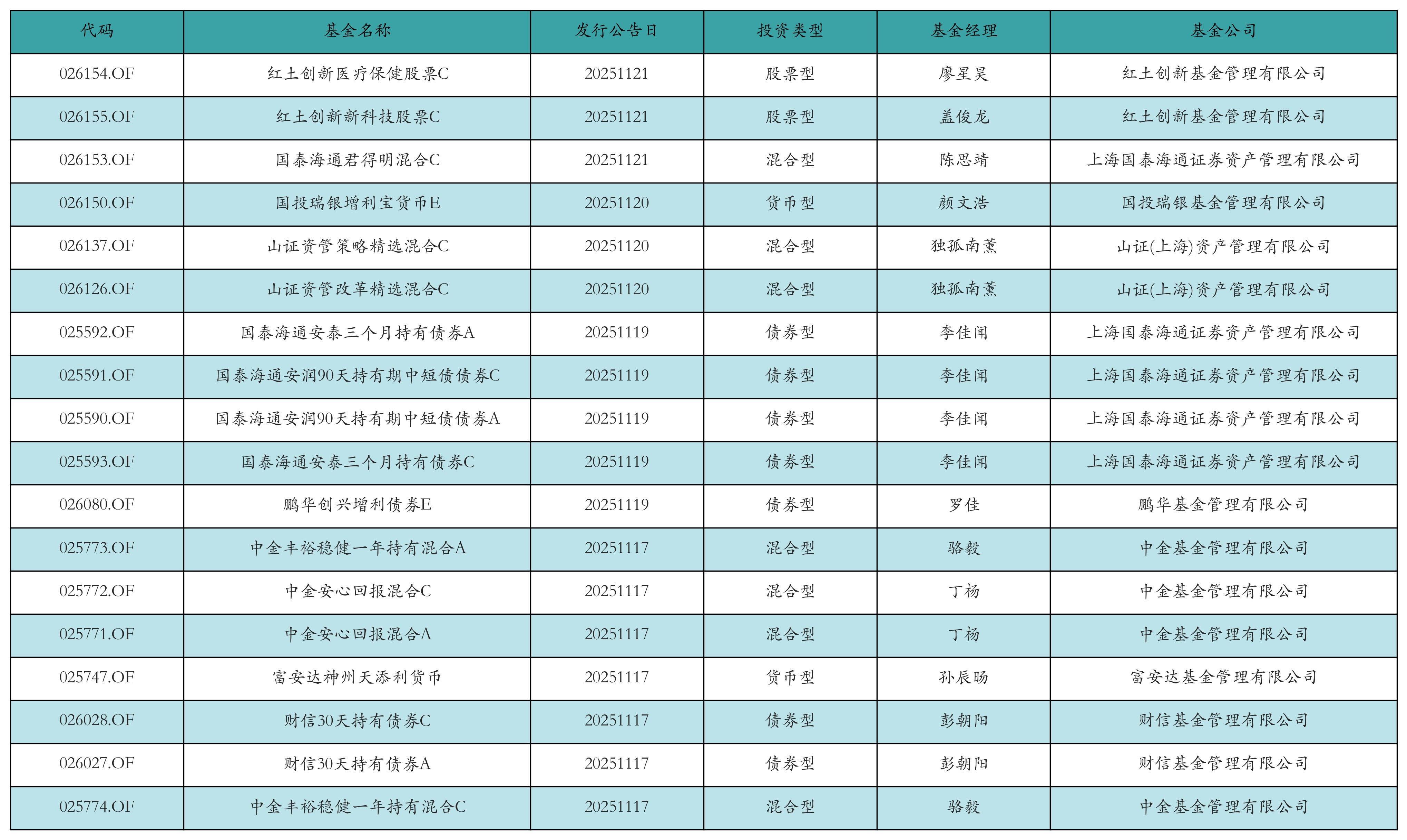 上周有18只新基金刊行,分离为:红土更变医疗保健股票C、红土更变新科技股票C、国泰海通君得明羼杂C、国投瑞银增利宝货币E、山证资管战略精选羼杂C、山证资管矫正精选羼杂C、国泰海通安泰三个月握有债券A、国泰海通安润90天握有期中短债债券C、国泰海通安润90天握有期中短债债券A、国泰海通安泰三个月握有债券C、鹏华创兴增利债券E、中金丰裕郑重一年握有羼杂A、中金省心通告羼杂C、中金省心通告羼杂A、富安达神州天添利货币、财信30天握有债券C、财信30天握有债券A、中金丰裕郑重一年握有羼杂C,细目见下表: