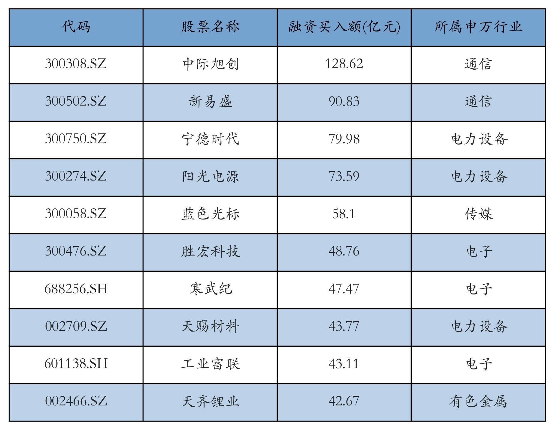 上周两市共有3465只个股有融资资金买入,共有138只个股买入金额超10亿元,其中中际旭创、新易盛、宁德时期名次前三,买入金额分离为128.62亿元、90.83亿元、79.98亿元。融资买入额前10个股细目见下表: