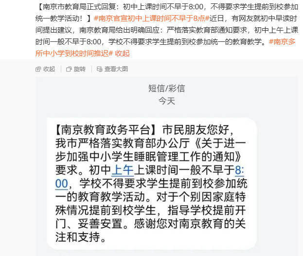 延伸到校的话题热度不减。1月5日南京多位家长爆料称,接到学校奉告:以后7:50-8:00到校,取消和谐早读。随后,围绕相干话题的探讨不仅冲上热搜,南京市素质局还于近日和谐回报:严格落实素质部奉告条件,初中上昼上课时辰一般不早于8:00,学校不得条件知生提前到校插足和谐的素质教化行动。此举被业内东说念主士无为解读为实行弹性安排,让更多家庭恪守本体进行决定,充分体现了东说念主文关切。