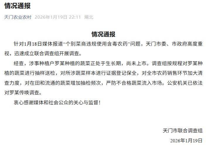 针对1月18日媒体报谈“个别菜商违章使用含毒农药”问题,天门市委、市政府高度心疼,飞速建造连合造访组开展造访。