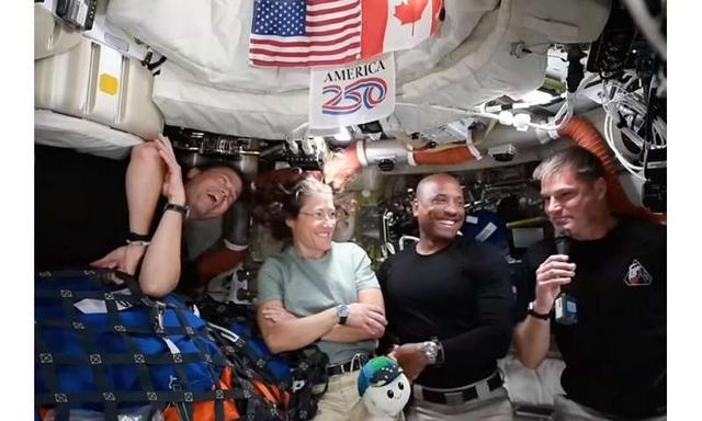 图释:这张由NASA提供的视频图像流露了Artemis II机构成员(从左起)勾通官里德·怀斯曼、任务大众克里斯蒂娜·科赫、漂荡员维克多·格洛弗和加拿大宇航员兼任务大众杰里米·汉森,他们在2026年4月8日星期三的视频会议中申诉媒体发问。图片开始:NASA转载好意思联社