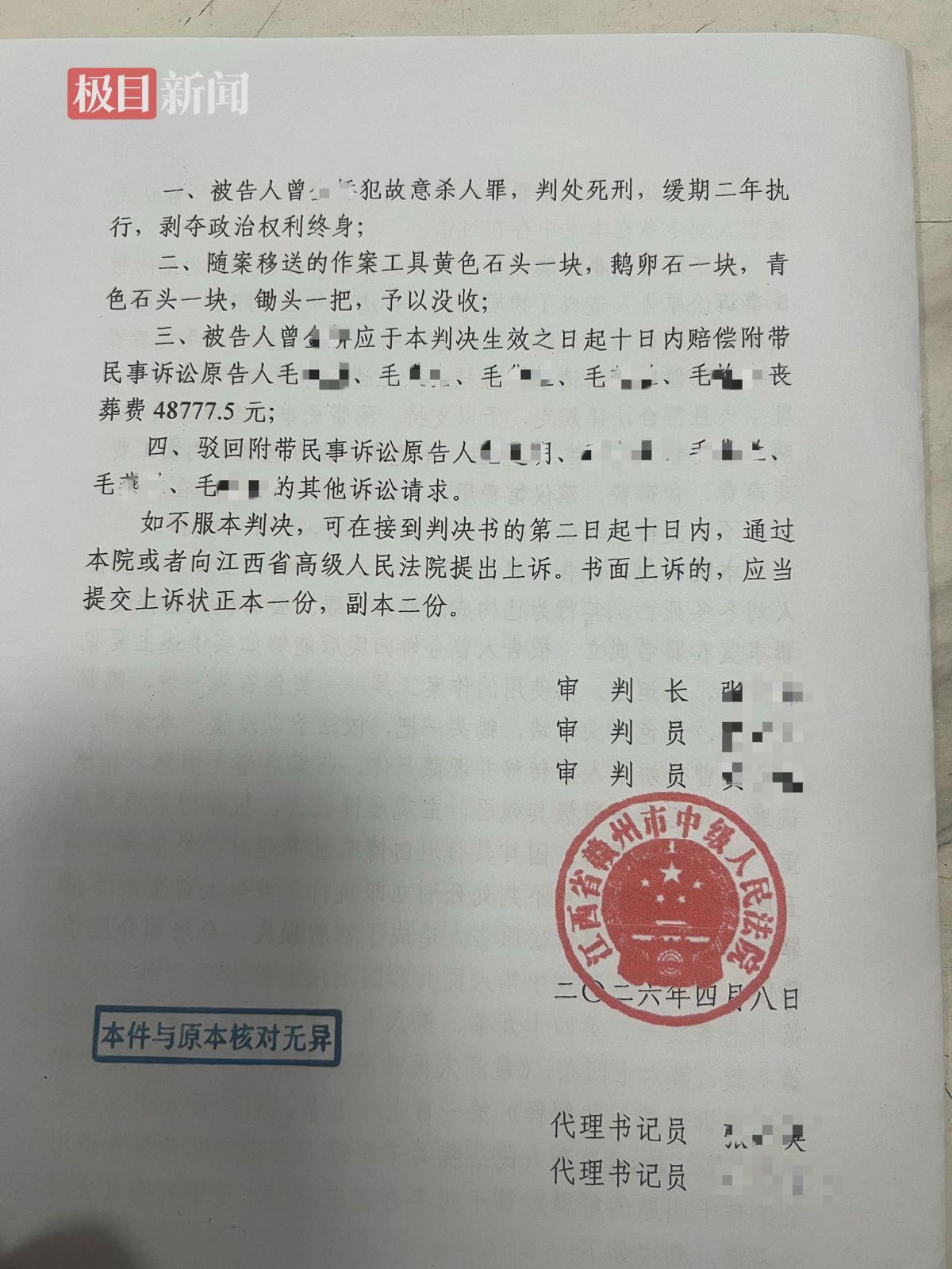 2026年4月14日下昼,赣州市中级东说念主民法院职责主说念主员向毛女士过甚家东说念主宣读了该案的判决效果。判决书走漏:被告东说念主曾某某犯有益杀东说念主罪,判正法刑,展期两年实行,强抢政事职权终生;同期,被告东说念主应于本判决成效之日起旬日内,补偿附带民事诉讼原告东说念主丧葬费48777.5元。