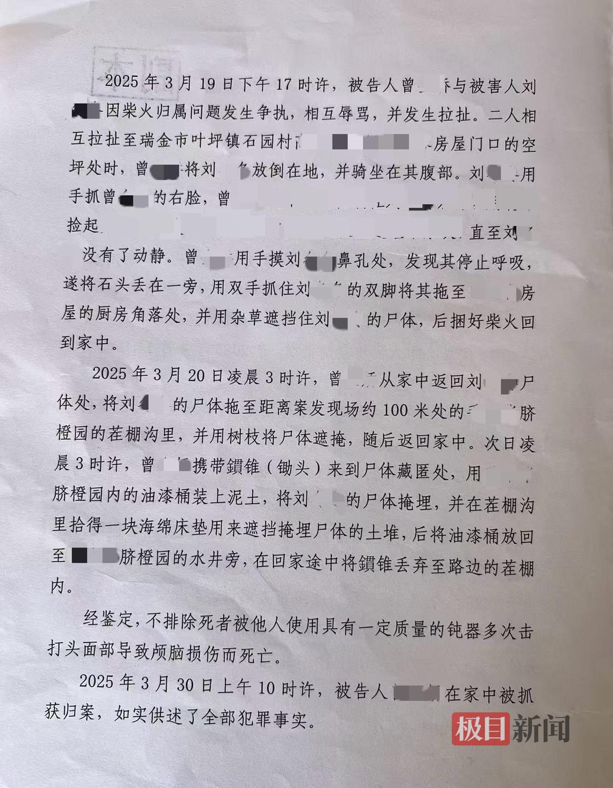 毛女士提供的告状书走漏,该案发生于2025年3月19日下昼5时许,被告东说念主曾某某与被害东说念主刘某因柴火包摄问题发生争执,二东说念主相互拉扯至一空坪处时,曾某某将刘某放倒在地,并骑坐在其腹部。刘某用手持曾某某面部,曾某某将其死心,持石块屡次击打刘某头部直至其莫得了动静。经法医决然,不排斥死者被他东说念主使工具有一定质地的钝器屡次击打头面部导致颅脑毁伤而牺牲。2025年3月30日上昼10时许,被告东说念主曾某某在家中被持获归案,照实供述了一皆犯警事实。